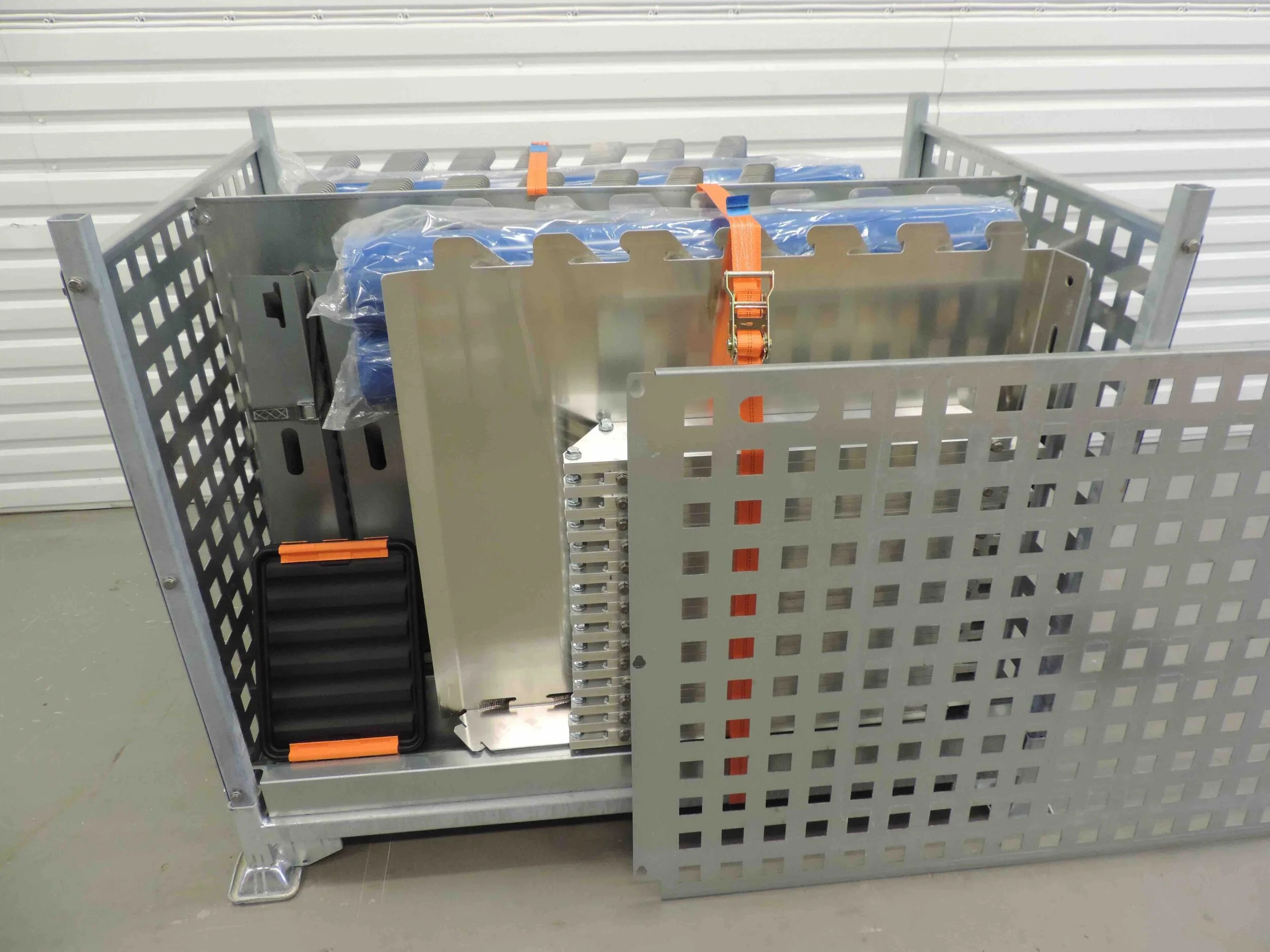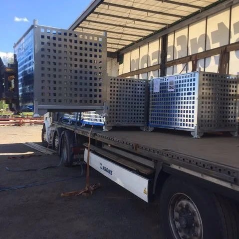 専用のカーゴパレット1台で、H80タイプの止水板100メートル分を収納可能。コンテナ1基には、最大で700メートル分を搭載できます。パレットは、フォークリフト・ホイールローダー・クレーンなどで簡単に持ち上げ可能。